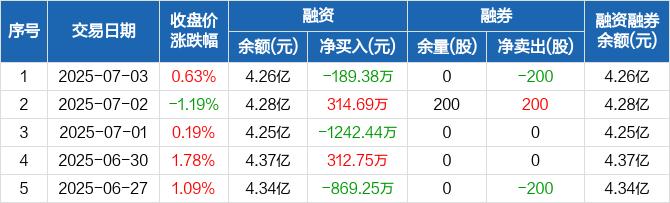 融资方面,当日融资买入1603.7万元,融资偿还1793.09万元,融资净偿还189.38万元。融券方面,融券卖出0股,融券偿还200股,融券余量0股,融券余额0元。融资融券余额合计4.26亿元。