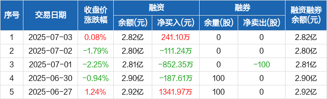 融资方面,当日融资买入1973.29万元,融资偿还1732.19万元,融资净买入241.1万元。融券方面,融券卖出0股,融券偿还0股,融券余量0股,融券余额0元。融资融券余额合计2.82亿元。
