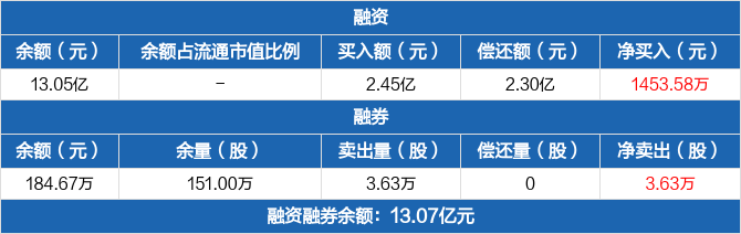 融资方面,当日融资买入2.45亿元,融资偿还2.3亿元,融资净买入1453.58万元。融券方面,融券卖出3.63万份,融券偿还0份,融券余量151万份,融券余额184.67万元。融资融券余额合计13.07亿元。