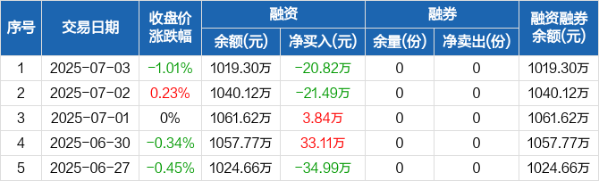 融资方面,当日融资买入71.57万元,融资偿还92.39万元,融资净偿还20.82万元。融券方面,融券卖出0份,融券偿还0份,融券余量0份,融券余额0元。融资融券余额合计1019.3万元。
