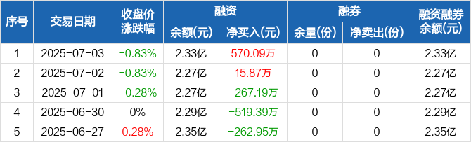 融资方面,当日融资买入1189.43万元,融资偿还619.34万元,融资净买入570.09万元。融券方面,融券卖出0份,融券偿还0份,融券余量0份,融券余额0元。融资融券余额合计2.33亿元。