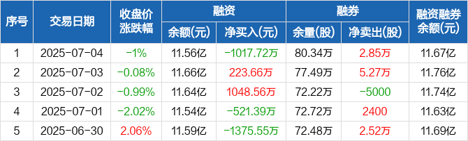 融资方面,当日融资买入1901.77万元,融资偿还2919.48万元,融资净偿还1017.72万元。融券方面,融券卖出3.05万股,融券偿还2000股,融券余量80.34万股,融券余额1030.71万元。融资融券余额合计11.67亿元。