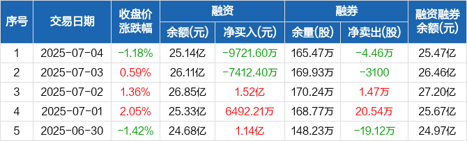融资方面,当日融资买入1.45亿元,融资偿还2.42亿元,融资净偿还9721.6万元,净偿还额两市排名第15。融券方面,融券卖出7.35万股,融券偿还11.81万股,融券余量165.47万股,融券余额3317.59万元。融资融券余额合计25.47亿元。