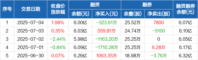 融资方面,当日融资买入6305.17万元,融资偿还6628.79万元,融资净偿还323.61万元。融券方面,融券卖出1.11万股,融券偿还3300股,融券余量25.52万股,融券余额750.6万元。融资融券余额合计6.07亿元。