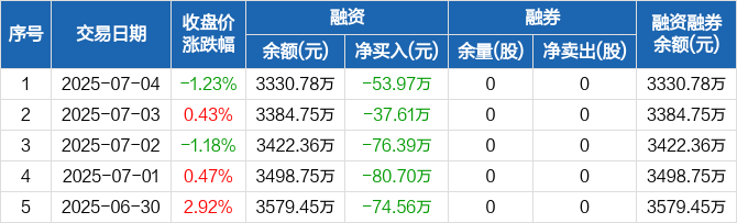 融资方面,当日融资买入124.58万元,融资偿还178.55万元,融资净偿还53.97万元,连续6日净偿还累计599.6万元。融券方面,融券卖出0股,融券偿还0股,融券余量0股,融券余额0元。融资融券余额合计3330.78万元。