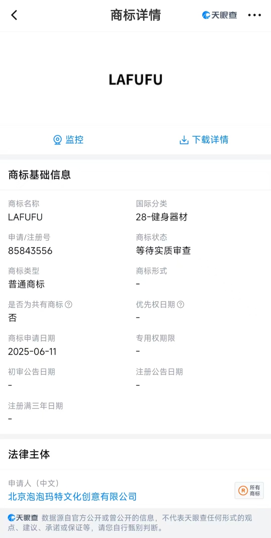 央广网北京7月7日消息(记者宓迪)据天眼查信息显示,北京泡泡玛特文化创意有限公司于6月11日申请注册“LAFUFU”商标,国际分类为健身器材,当前商标状态为等待实质审查。