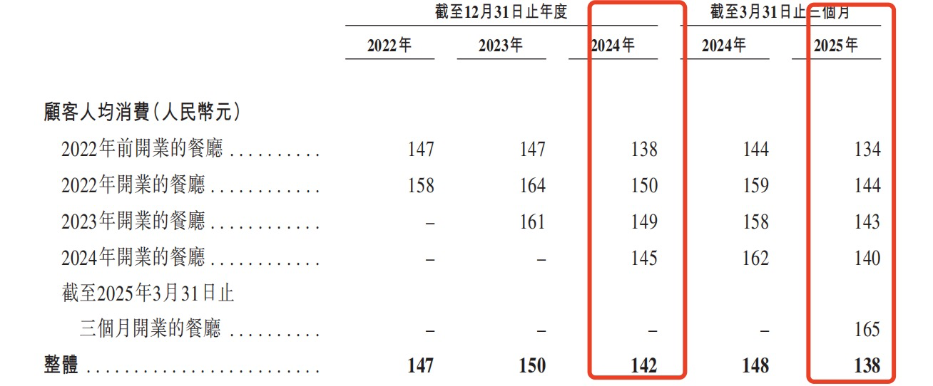 不仅如此,巴奴火锅的客单价也在下滑。2024年,巴奴火锅的人均消费是142元,不仅低于疫情放开后2023年的150元,也不及疫情期间2022年的147元。尤其是,2024年新店客单价明显低于2022-2023年开业的门店,仅略高于更早期老店。步入2025年一季度,巴奴火锅的客单价继续下滑,人均消费同比下滑10元。