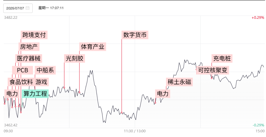 财联社7月8日电,市场全天震荡调整,沪指尾盘翻红,创业板指领跌。个股涨多跌少,全市场超3200只个股上涨。沪深两市全天成交额1.21万亿,较上周五缩量2199亿。1)国家能源局数据显示,7月4日,全国最大电力负荷达到14.65亿千瓦,较6月底上升约2亿千瓦,创历史新高。电力板块持续站上风口,上半年净利润大幅预增36倍的华银电力晋级3连板,带动韶能股份、深南电A等十余股涨停。2)7月4日,央行就《人民币跨境支付系统业务规则(征求意见稿)》公开征求意见。利好消息频传刺激稳定币、跨境支付两大板块双双爆发,人气股京北方晋级2连板再创历史新高,中亦科技、信雅达、海联金汇等多股报收涨停。此外稳定币交易牌照相关的多元金融板块今日同样表现不俗,永安期货反包涨停,弘业期货日内亦一度逼近涨停。3)7月5日晚间开始,美团、淘宝闪购两大平台发放大量外卖红包券,外卖补贴大战进入白热化阶段。A股方面食品饮料以及外卖包装等细分迎来爆发,海融科技、恒鑫生活、家联科技等纷纷涨停。4)上周住建部调研组赴广东、浙江两省调研,要求更大力度推动房地产市场止跌回稳。房地产板块全天表现远强于大盘,渝开发、南山控股等多股涨停,金地集团、新城控股、招商蛇口等涨幅靠前。