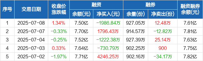 融资方面,当日融资买入6857.2万元,融资偿还8844.04万元,融资净偿还1986.84万元。融券方面,融券卖出22.97万份,融券偿还10.49万份,融券余量927.05万份,融券余额1120.8万元。融资融券余额合计7.61亿元。