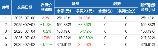 融资方面,当日融资买入119.98万元,融资偿还28.68万元,融资净买入91.3万元。融券方面,融券卖出0份,融券偿还0份,融券余量0份,融券余额0元。融资融券余额合计251.13万元。