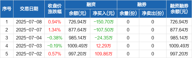 融资方面,当日融资买入57.06万元,融资偿还207.76万元,融资净偿还150.7万元,连续3日净偿还累计282.54万元。融券方面,融券卖出0份,融券偿还0份,融券余量0份,融券余额0元。融资融券余额合计726.94万元。