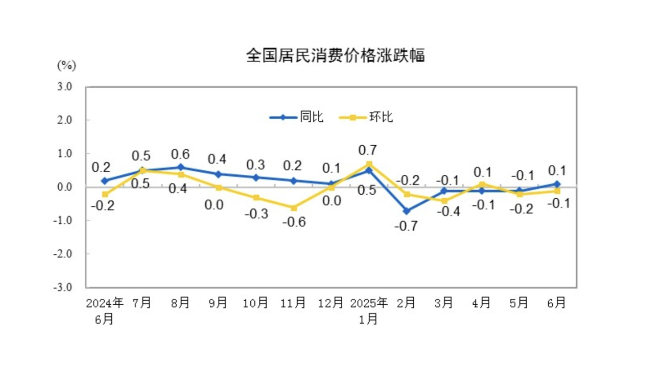 国家统计局数据显示,6月CPI同比由上月下降转为上涨0.1%;环比下降0.1%。PPI环比下降0.4%,降幅与上月相同;同比下降3.6%,降幅比上月扩大0.3个百分点。