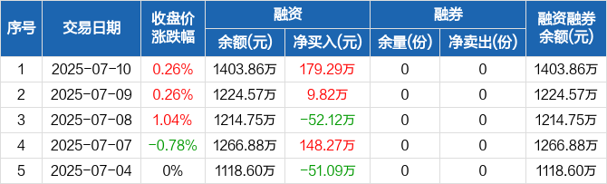 融资方面,当日融资买入267.8万元,融资偿还88.5万元,融资净买入179.29万元。融券方面,融券卖出0份,融券偿还0份,融券余量0份,融券余额0元。融资融券余额合计1403.86万元。