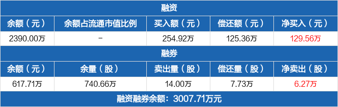 融资方面,当日融资买入254.92万元,融资偿还125.36万元,融资净买入129.56万元,连续3日净买入累计344.43万元。融券方面,融券卖出14万份,融券偿还7.73万份,融券余量740.66万份,融券余额617.71万元。融资融券余额合计3007.71万元。