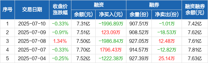 融资方面,当日融资买入5461.55万元,融资偿还7458.44万元,融资净偿还1996.89万元。融券方面,融券卖出4.13万份,融券偿还5.14万份,融券余量907.51万份,融券余额1083.57万元。融资融券余额合计7.42亿元。