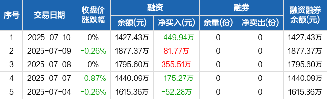 融资方面,当日融资买入279.5万元,融资偿还729.44万元,融资净偿还449.94万元。融券方面,融券卖出0份,融券偿还0份,融券余量0份,融券余额0元。融资融券余额合计1427.43万元。
