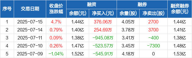 融资方面,当日融资买入5060.7万元,融资偿还4684.64万元,融资净买入376.06万元。融券方面,融券卖出5300股,融券偿还2600股,融券余量4.05万股,融券余额48.76万元。融资融券余额合计1.44亿元。