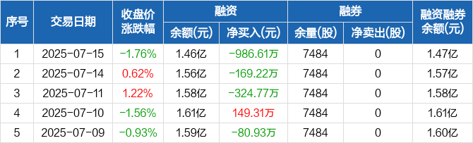 融资方面,当日融资买入623.13万元,融资偿还1609.74万元,融资净偿还986.61万元,连续3日净偿还累计1480.6万元。融券方面,融券卖出0股,融券偿还0股,融券余量7484股,融券余额50.24万元。融资融券余额合计1.47亿元。