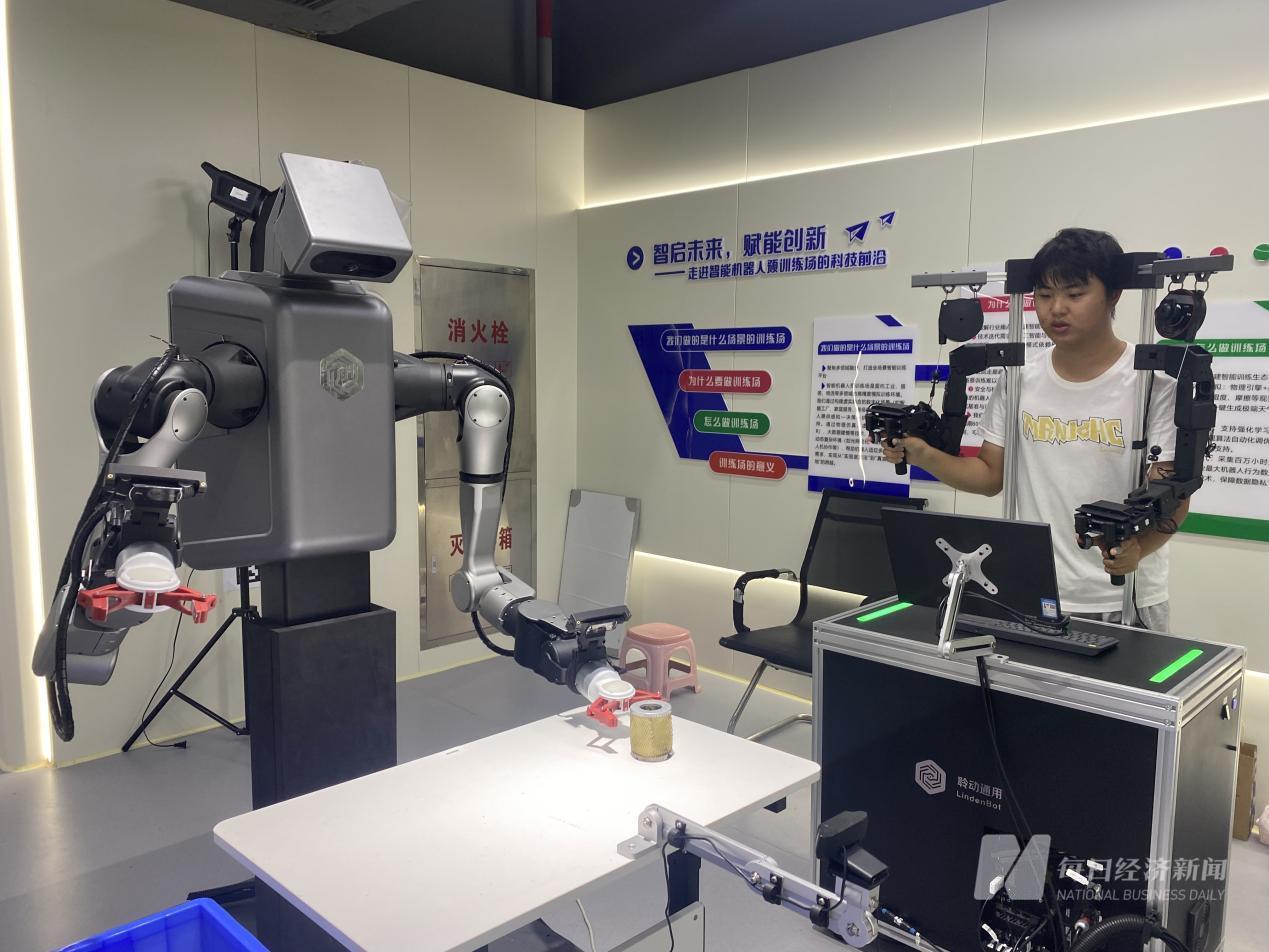 “带教老师”利用遥操作系统示教机器人,图片来源:每经记者张宝莲摄
