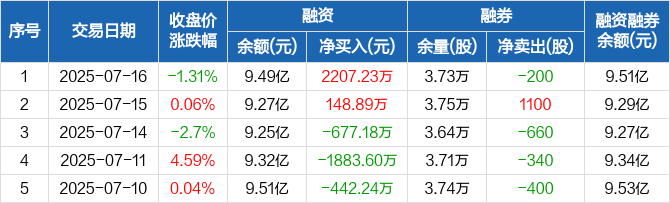 融资方面,当日融资买入4602.53万元,融资偿还2395.3万元,融资净买入2207.23万元。融券方面,融券卖出200股,融券偿还400股,融券余量3.73万股,融券余额199.13万元。融资融券余额合计9.51亿元。