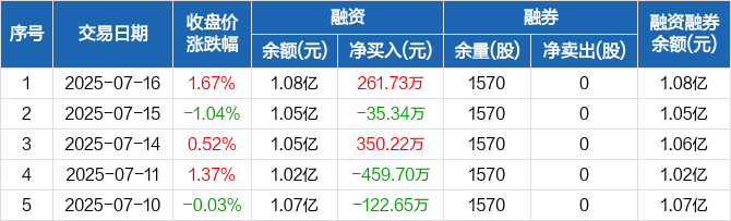 融资方面,当日融资买入506.15万元,融资偿还244.41万元,融资净买入261.73万元。融券方面,融券卖出0股,融券偿还0股,融券余量1570股,融券余额5.16万元。融资融券余额合计1.08亿元。