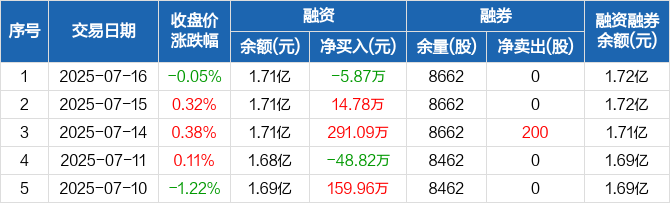 融资方面,当日融资买入610.71万元,融资偿还616.58万元,融资净偿还5.87万元。融券方面,融券卖出0股,融券偿还0股,融券余量8662股,融券余额16.24万元。融资融券余额合计1.72亿元。
