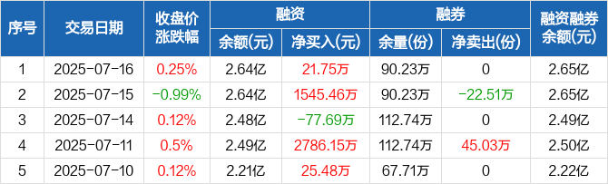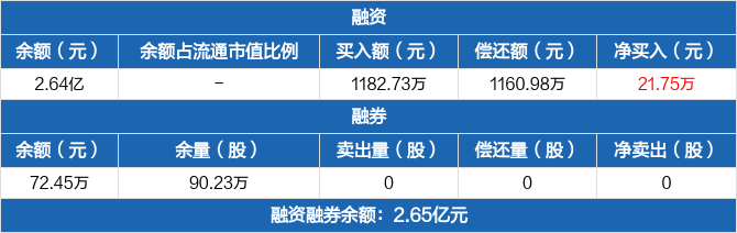 融资方面,当日融资买入1182.73万元,融资偿还1160.98万元,融资净买入21.75万元。融券方面,融券卖出0份,融券偿还0份,融券余量90.23万份,融券余额72.45万元。融资融券余额合计2.65亿元。