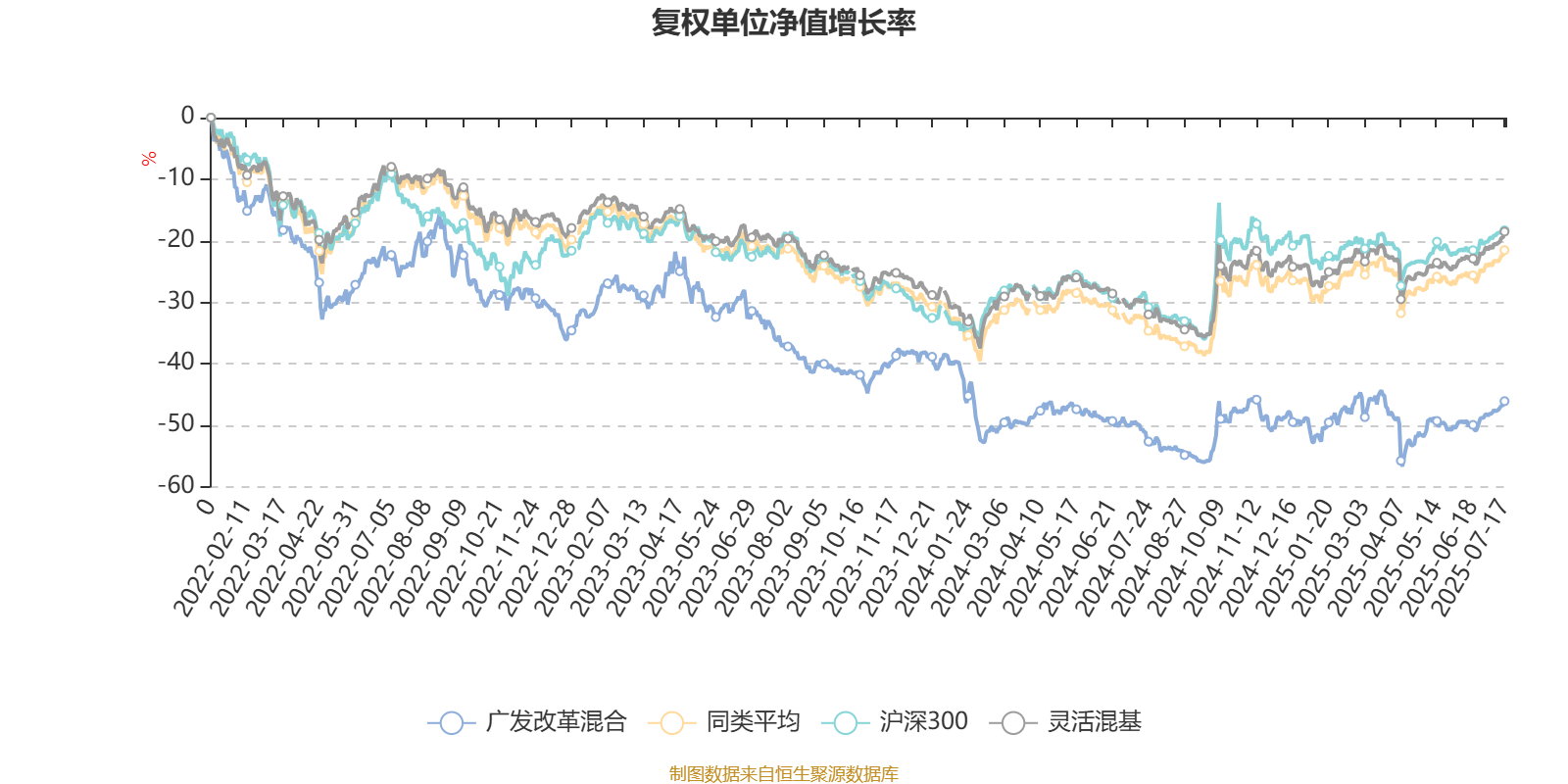 截至7月17日,广发改革混合近三个月复权单位净值增长率为15.31%,位于同类可比基金160/880;近半年复权单位净值增长率为8.23%,位于同类可比基金424/880;近一年复权单位净值增长率为9.62%,位于同类可比基金606/880;近三年复权单位净值增长率为-28.59%,位于同类可比基金747/870。