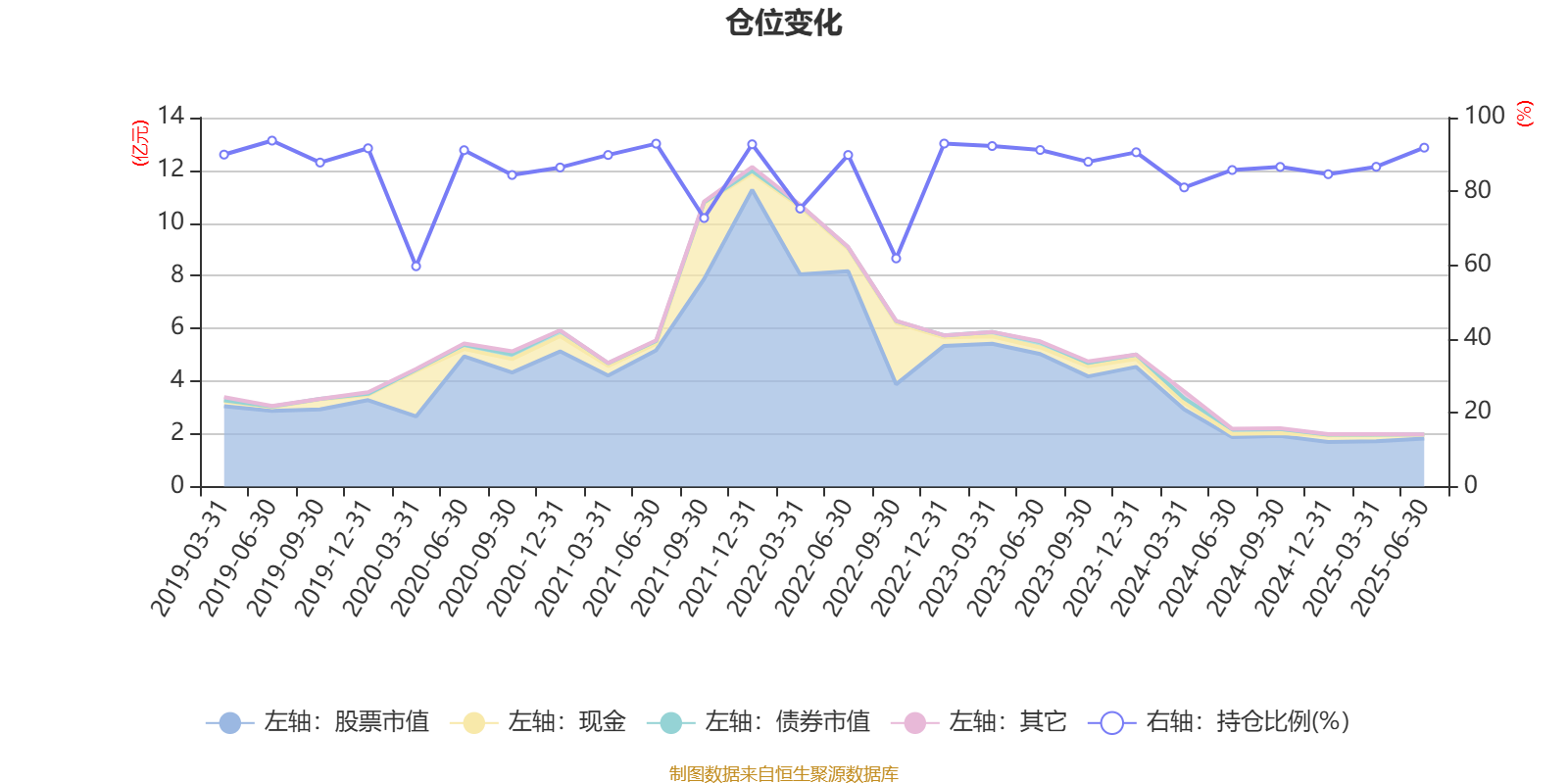 据定期报告数据统计,近三年平均股票仓位为86.14%,同类平均为80.33%。2019年上半年末基金达到93.76%的最高仓位,2020年一季度末最低,为59.71%。