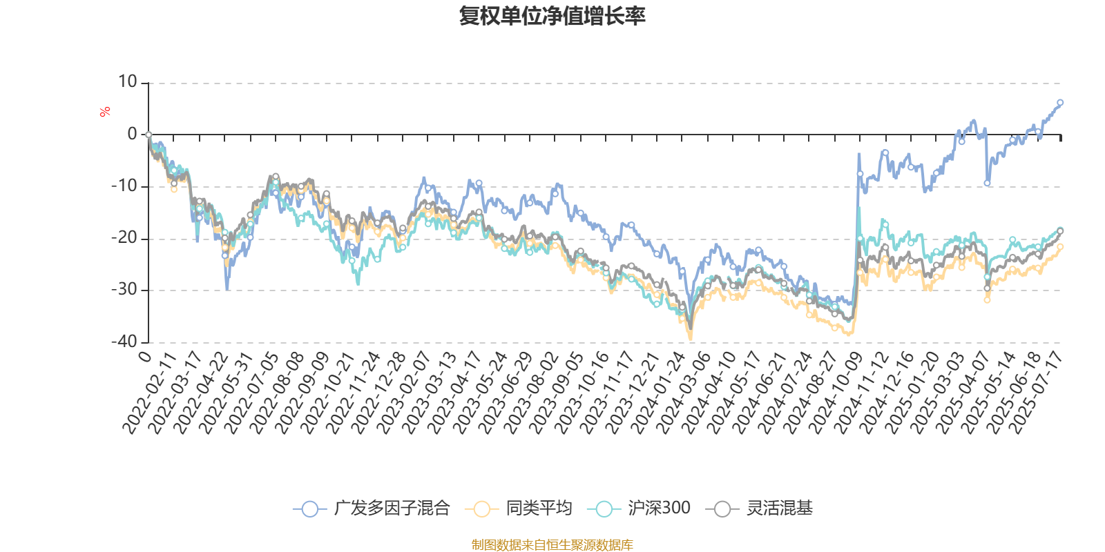 截至7月17日,广发多因子混合近三个月复权单位净值增长率为12.46%,位于同类可比基金262/880;近半年复权单位净值增长率为15.74%,位于同类可比基金159/880;近一年复权单位净值增长率为48.48%,位于同类可比基金42/880;近三年复权单位净值增长率为24.34%,位于同类可比基金51/870。