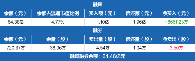融资方面,当日融资买入1.1亿元,融资偿还1.96亿元,融资净偿还8661.23万元,净偿还额两市排名第18。融券方面,融券卖出4.54万股,融券偿还1.04万股,融券余量38.96万股,融券余额720.37万元。融资融券余额合计64.46亿元。