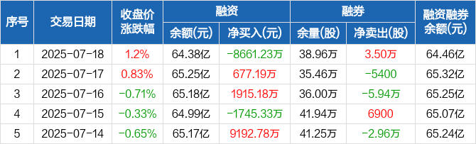 华泰证券融资融券信息显示,2025年7月18日融资净偿还8661.23万元;融资余额64.38亿元,较前一日下降1.33%。