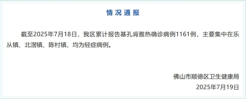 7月19日,广东佛山市顺德区卫生健康局通报,截至2025年7月18日,顺德区累计报告基孔肯雅热确诊病例1161例,主要集中在乐从镇、北滘镇、陈村镇,均为轻症病例。