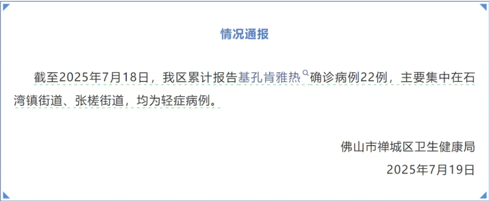 佛山市禅城区卫生健康局通报:截至2025年7月18日,禅城区累计报告基孔肯雅热确诊病例22例,主要集中在石湾镇街道、张槎街道,均为轻症病例。