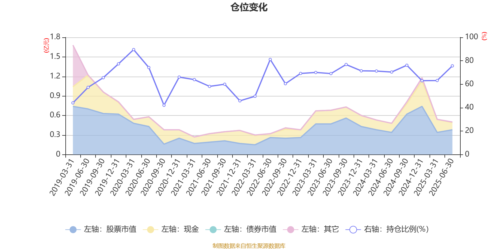 据定期报告数据统计,近三年平均股票仓位为69.73%,同类平均为85.8%。2020年一季度末基金达到89.55%的最高仓位,2020年三季度末最低,为42.05%。