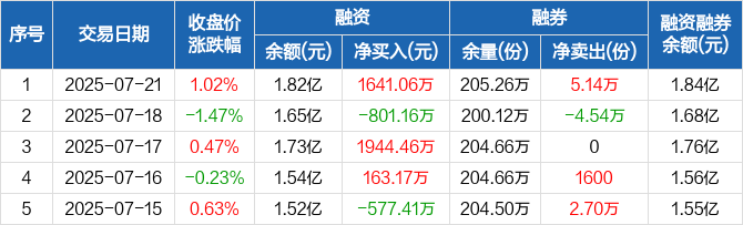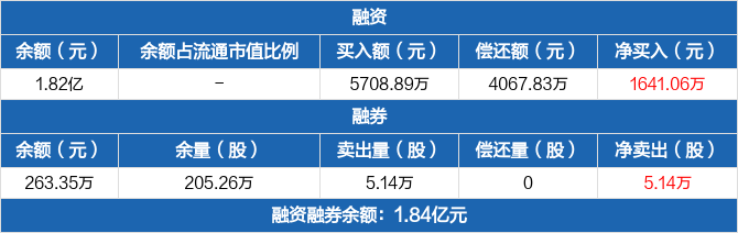 融资方面,当日融资买入5708.89万元,融资偿还4067.83万元,融资净买入1641.06万元。融券方面,融券卖出5.14万份,融券偿还0份,融券余量205.26万份,融券余额263.35万元。融资融券余额合计1.84亿元。