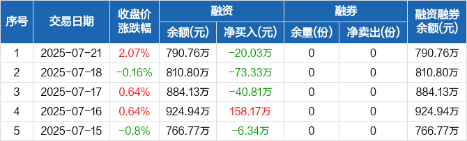 融资方面,当日融资买入151.3万元,融资偿还171.34万元,融资净偿还20.03万元,连续3日净偿还累计134.18万元。融券方面,融券卖出0份,融券偿还0份,融券余量0份,融券余额0元。融资融券余额合计790.76万元。