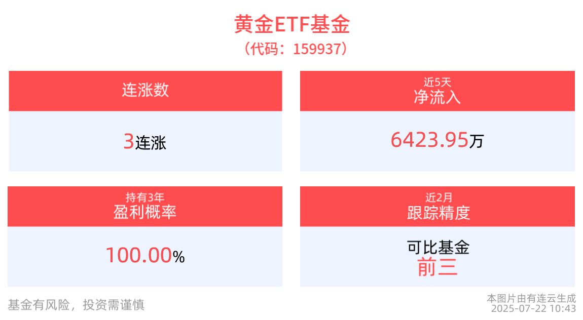 跟踪精度方面,截至2025年7月21日,黄金ETF基金近2月跟踪误差为0.002%,在可比基金中跟踪精度较高。