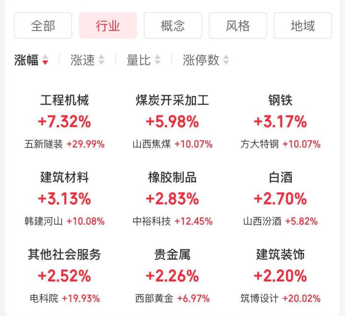盘面上,工程机械、煤炭开采加工、钢铁、建筑材料等行业板块涨幅居前。