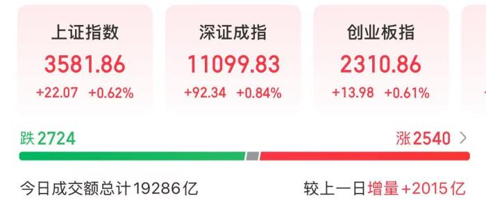 截至收盘,沪指收涨0.62%报3581.86点;深成指涨0.84%报11099.83点;创业板指涨0.61%报2310.86点。A股全天成交额1.93万亿元,创3月6日以来新高。