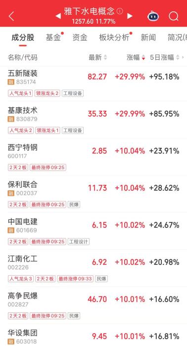 概念板块方面,雅下水电概念连续走强,五新隧装、基康技术、西宁特钢、保利联合、中国电建等20多只相关个股涨停,民爆概念、水泥概念、抽水蓄能等亦表现亮眼。