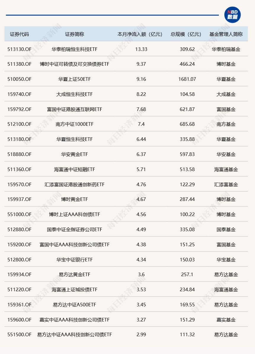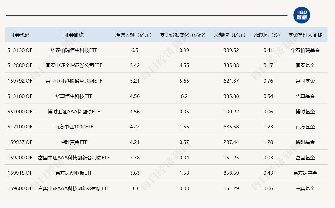 ETF规模速报 | 恒生科技ETF净流入额达6.5亿元,科创50ETF净流出逾8亿元