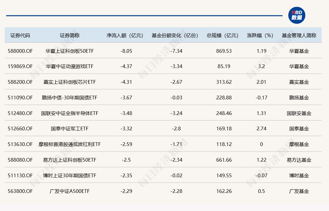 与此同时,华夏上证科创板50ETF份额减少7.34亿份,净流出额为8.05亿元;华夏中证动漫游戏ETF份额减少3.34亿份,净流出额为4.37亿元;嘉实上证科创板芯片ETF份额减少2.67亿份,净流出额为4.31亿元。
