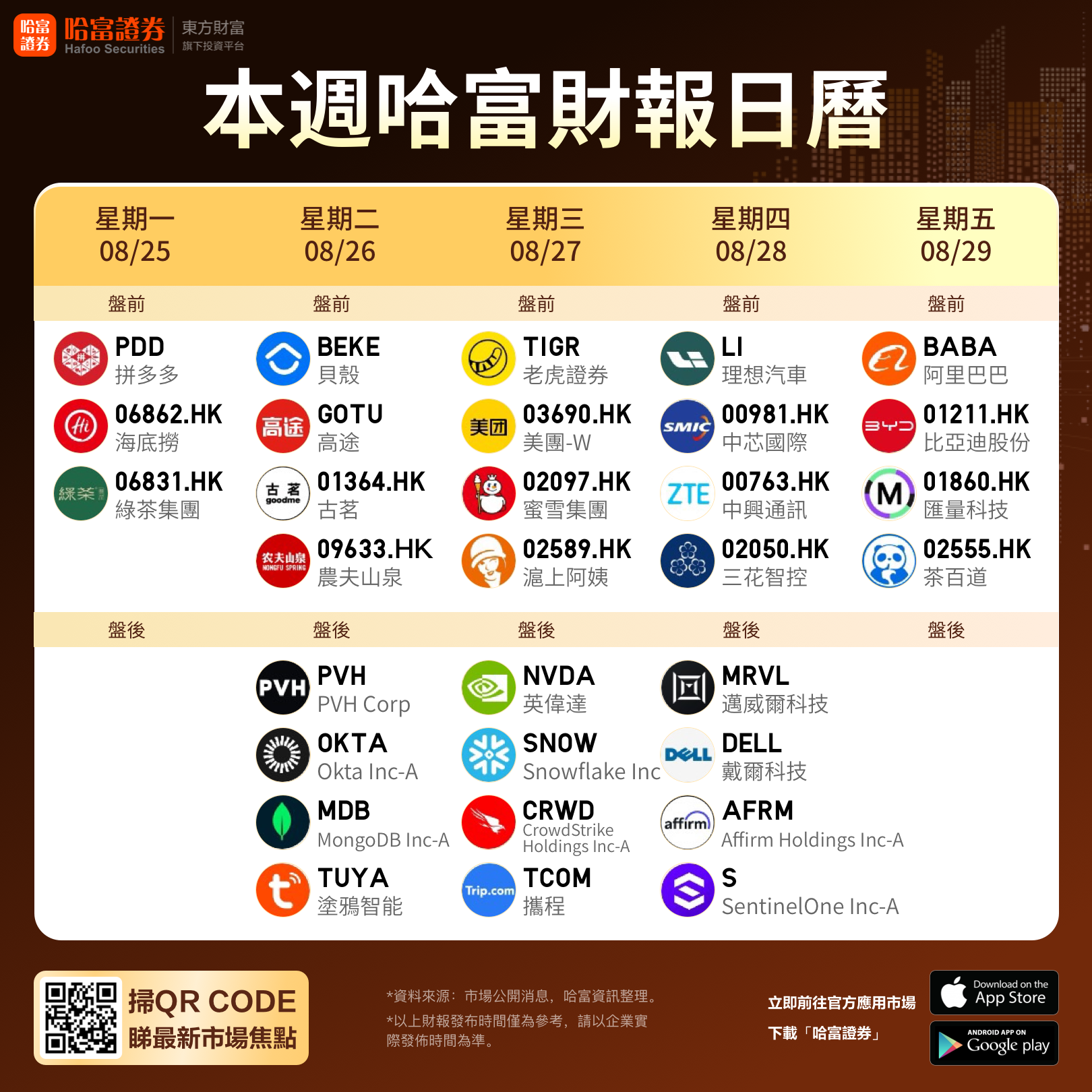 下周港股明星股持续扎堆放榜,如美团-W(03690.HK)、 理想汽车-W(02015.HK) 、 阿里巴巴-W(09988.HK) 、 比亚迪股份(01211.HK) 、 蜜雪集团(02097.HK) 等等;此外,中概股拼多多(PDD.US) 下周一放榜。港股IPO方面,储能电池厂商双登股份(06960.HK) 周二上市;钨矿新贵佳鑫国际资源(03858.HK)将于周四上市。