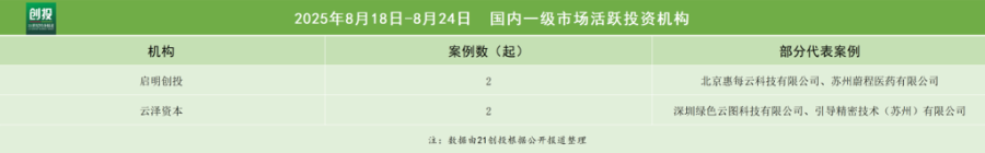 从机构投资活跃度来看,本周启明创投与云泽资本较为活跃,各完成2笔融资,主要聚集在医疗健康领域和科技与制造领域。