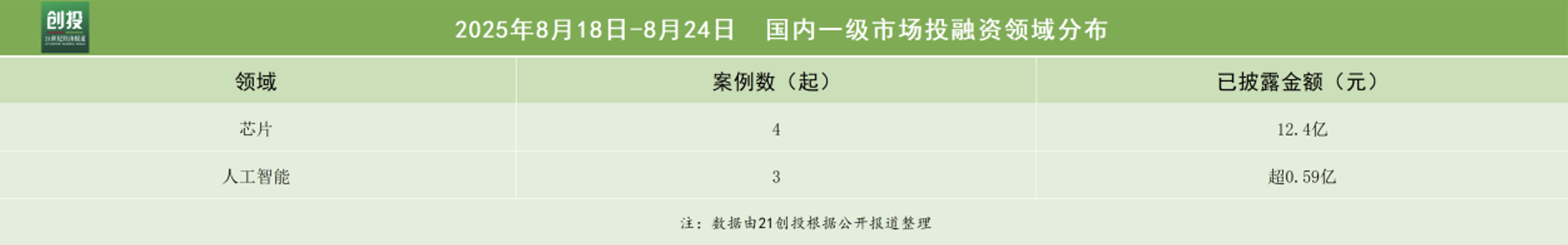 21创投不完全统计,8月18日—8月24日,报告日期内国内一级市场发生融资事件34起。其中,有27笔融资披露了融资金额和币种信息,总规模约合人民币44.86亿元。