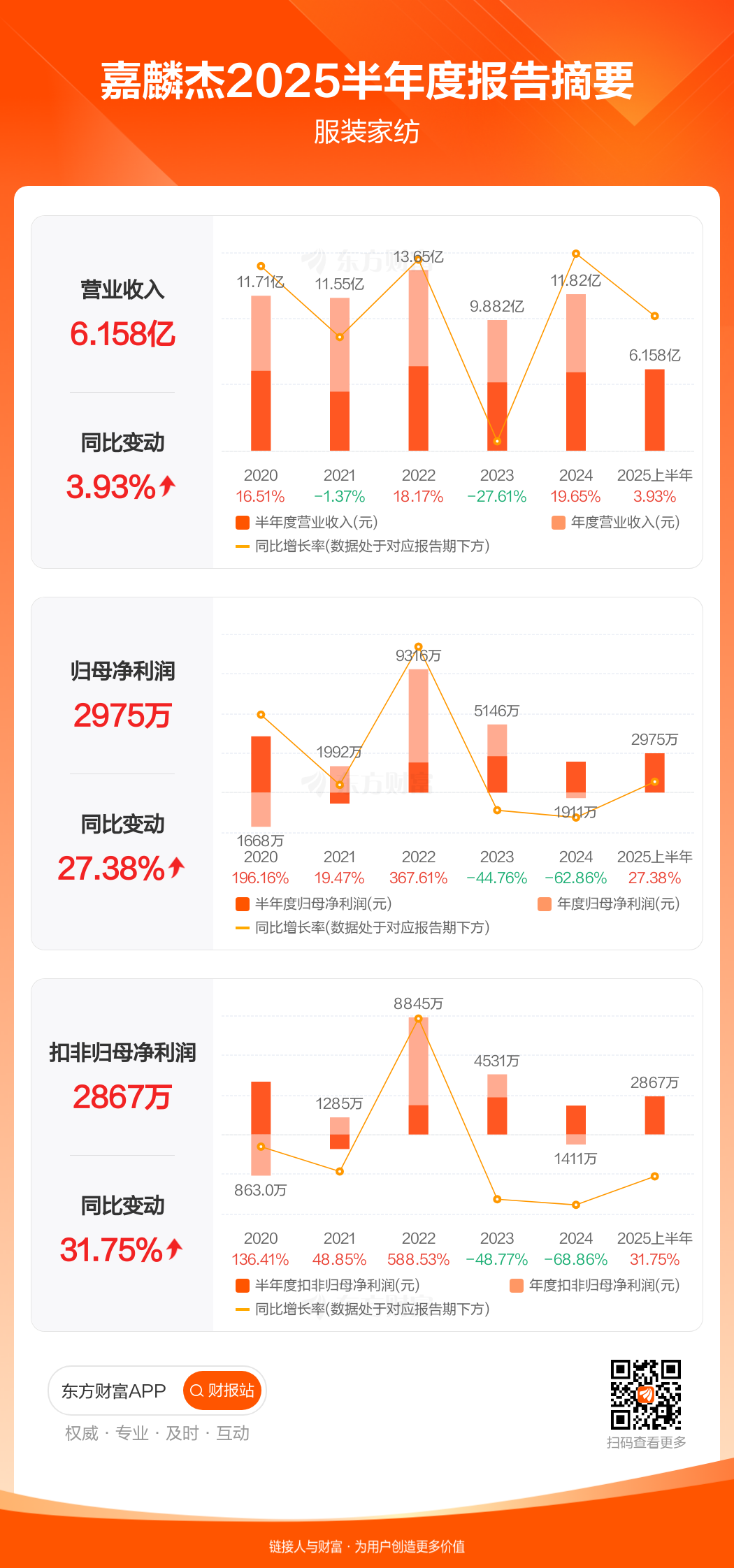 嘉麟杰发布2025半年度报告显示,公司上半年实现营业收入6.16亿元,同比增长3.93%;归母净利润2974.89万元,同比增长27.38%;扣非归母净利润2867.41万元,同比增长31.75%。