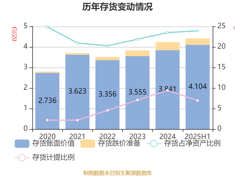 从存货变动来看,截至2025年上半年末,公司存货账面价值为4.1亿元,占净资产的23.93%,较上年末增加2623.95万元。其中,存货跌价准备为3063.19万元,计提比例为6.95%。