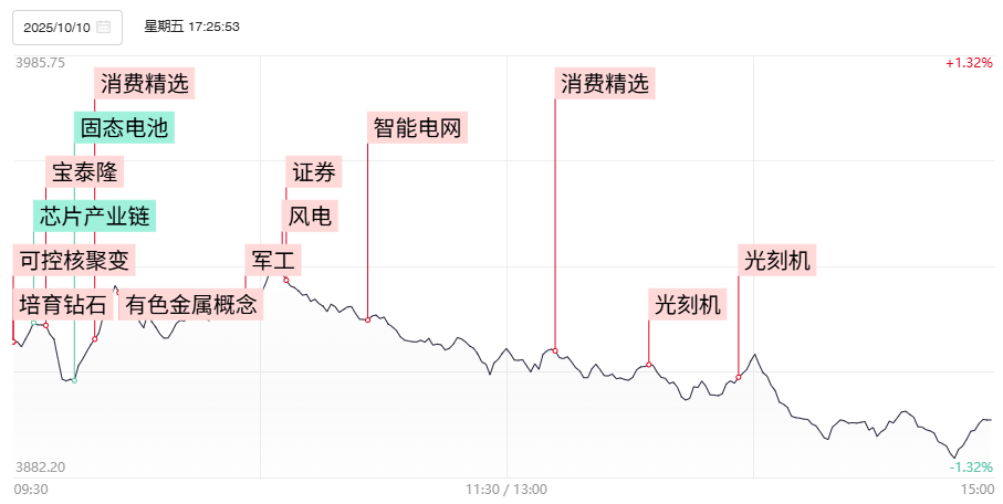 财联社10月13日电,上个交易日市场全天震荡调整,三大指数集体下跌,大小盘股分化明显。沪深两市成交额2.52万亿,缩量1376亿。1)近期国内可控核聚变产业取得多项积极进展,可控核聚变概念仍维持较强承接,人气龙头合锻智能连续2日封死一字涨停,安泰科技、中国核建、白银有色实现连板晋级,常辅股份、哈焊华通、中洲特材等20、30厘米人气股盘中也呈现出较强承接。2)近日,证监会官网显示,经过两个月时间,国内DRAM龙头企业长鑫科已发布IPO辅导工作完成报告,这意味着距离IPO又进一步。参股拟上市芯片公司的创投股全天逆势活跃,人气股大众公用走出9天5板,养元饮品、联美控股、七匹狼等逆势涨停,摩尔线程概念股初灵信息也一度逼近涨停创出阶段新高。3)据业内人士透露,微软在美国的许多数据中心区域正面临物理空间或服务器短缺的问题,而高盛将电网投资预期从7月份的7200亿美元上调至7800亿美元(截至2030年)。电网设备、数据中心电源概念盘中逆势活跃,国电南自、四方股份等多股涨停,金盘科技一度涨逾15%创出历史新高。4)2025年“双十一”电商大促号角已经提前吹响, 快手已于10月7日开启商城预售,抖音和京东已经于10月9日同日启动双十一活动。大消费概念受此提振逆势活跃,其中深度受益电商的MCN、宠物、美妆等方向领涨,遥望科技、依依股份涨停,水羊股份、嘉亨家化、源飞宠物等涨幅靠前。