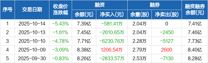 融资方面,当日融资买入1.13亿元,融资偿还1.18亿元,融资净偿还581.41万元,连续3日净偿还累计9422.81万元。融券方面,融券卖出0股,融券偿还0股,融券余量2.04万股,融券余额171.98万元。融资融券余额合计7.41亿元。